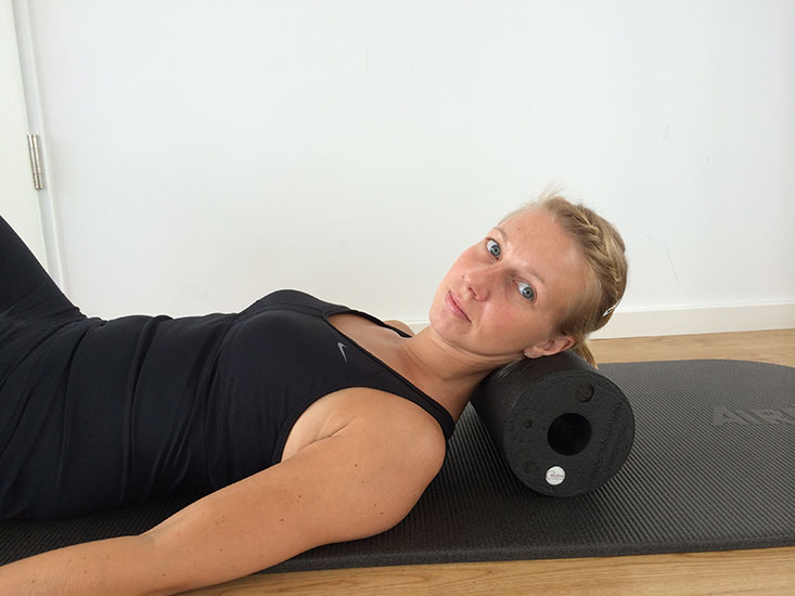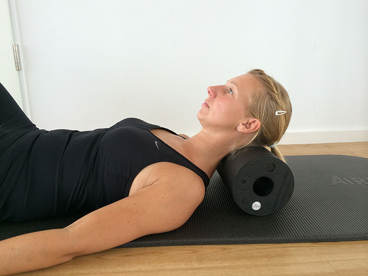 Rückenlage, Beine angestellt, Faszienrolle unter den Nacken.