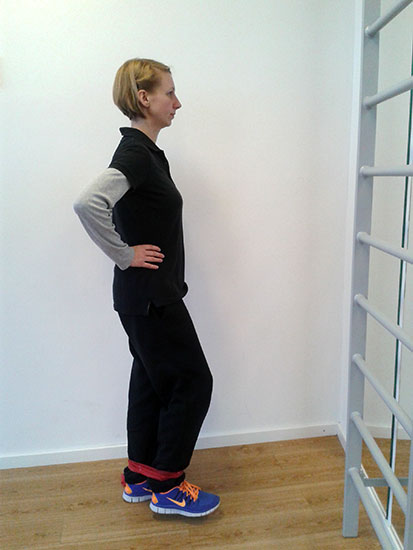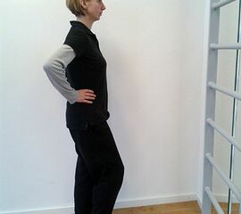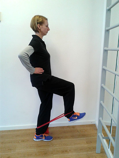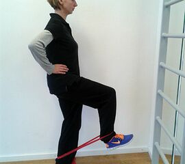 Mit dem Rücken zur Tür oder Tisch stehen und das Bein nach vorne ziehen.