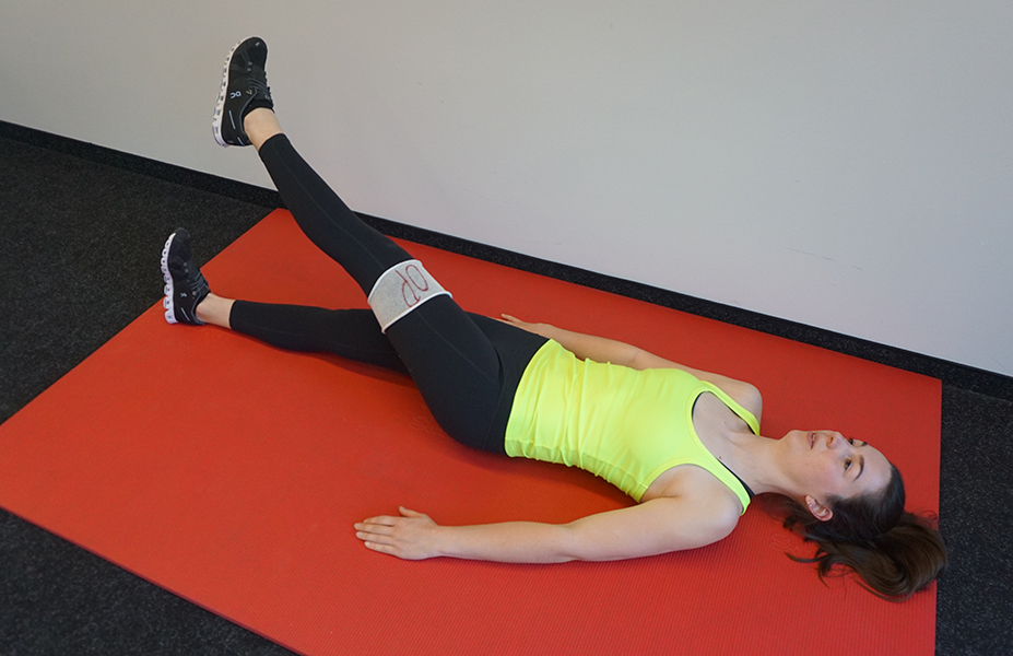 Das operierte Bein wird gestreckt etwas vom Boden angehoben und im Wechsel nach außen und nach innen (über das andere Bein hinweg) geführt. Die Zehenspitzen zeigen jeweils in Bewegungsrichtung.